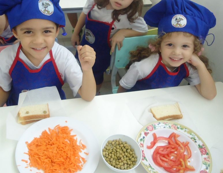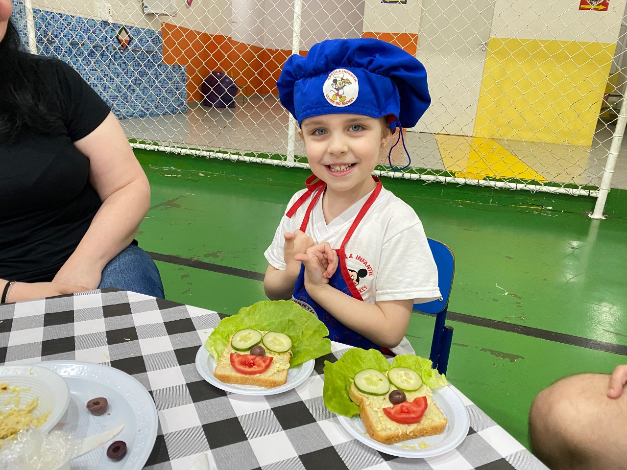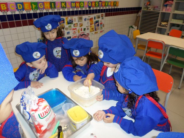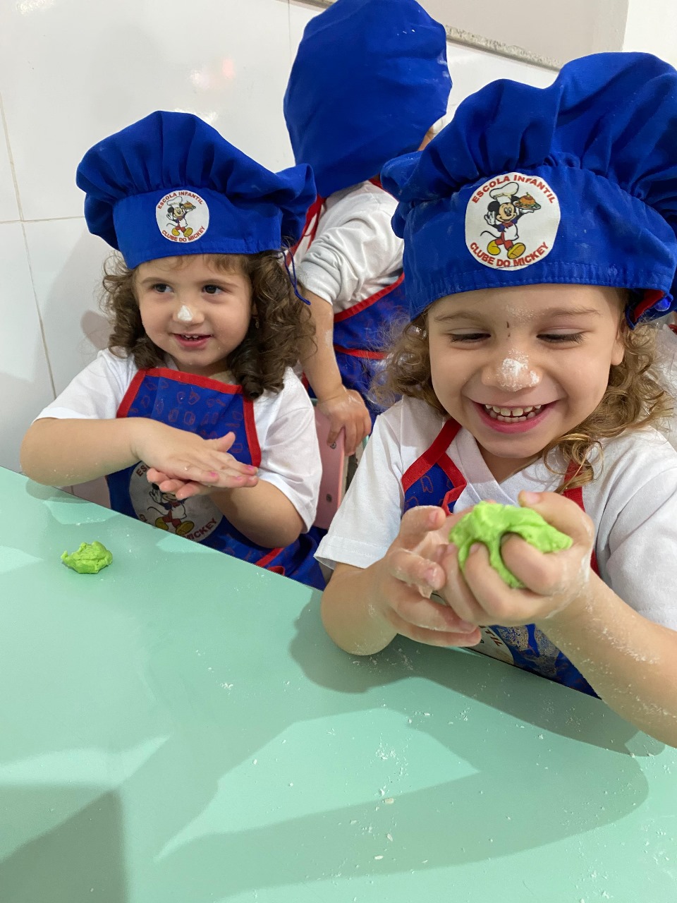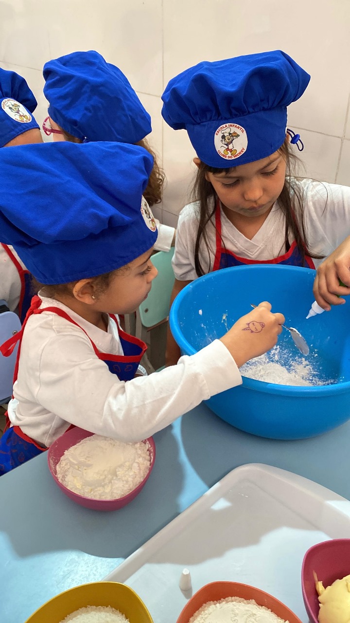 Nas aulas de culinária, trabalhamos hábitos de higiene, cuidados com os utensílios da cozinha, além de conceitos como mistura de ingredientes, medidas, proporções e divisão. A atividade fortalece a autonomia, amplia o repertório sensorial e incentiva a experimentação.